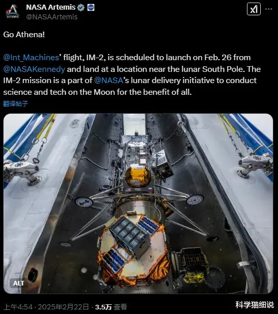 美国宇航局(NASA)宣布!2月26日,美国将发射本国2025年第二艘月球着陆器——“雅典娜月亮着陆器”,并且前往月球南极区域,这也是Intuitive Machines 第二个为美国重返月球计划提供支持的任务,任务代码为 “IM-2”。